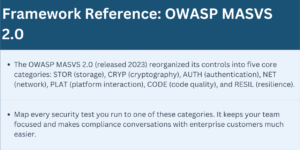 The OWASP Mobile Application Security Verification Standard (MASVS) is the industry baseline. For startups, think of it in three tiers: L1 is the floor (basic security hygiene, non-negotiable), L2 is where you want to be before Series B, and L3 is defense-in-depth for fintech, healthtech, and enterprise.