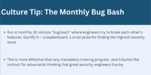 Designate one engineer per squad as the security champion. They don’t need to be experts — they need to be curious and empowered. Give them access to training (OWASP, TCM Security, Offensive Security), time to run security reviews before major releases, and a direct line to your CISO or senior security advisor.
